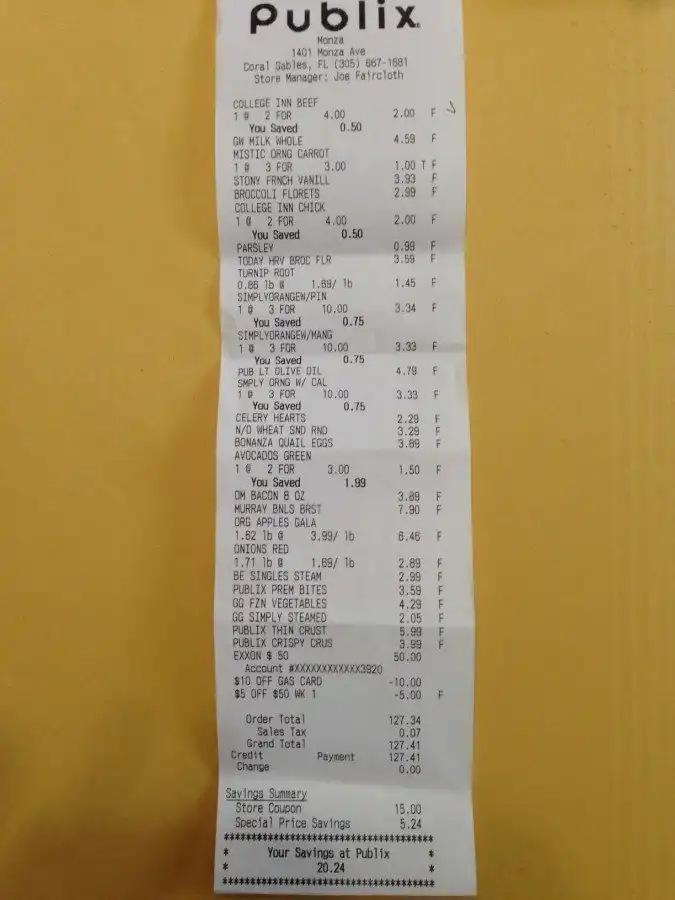 Купив продуктов на 50 долларов, наши герои воспользовались скидкой в 10 долларов на покупку карточки на бензин. Был использован скидочный купон на 5 долларов, а еще кассир пробил один авокадо вместо двух, что помогло сэкономить еще 1,5 доллара.
