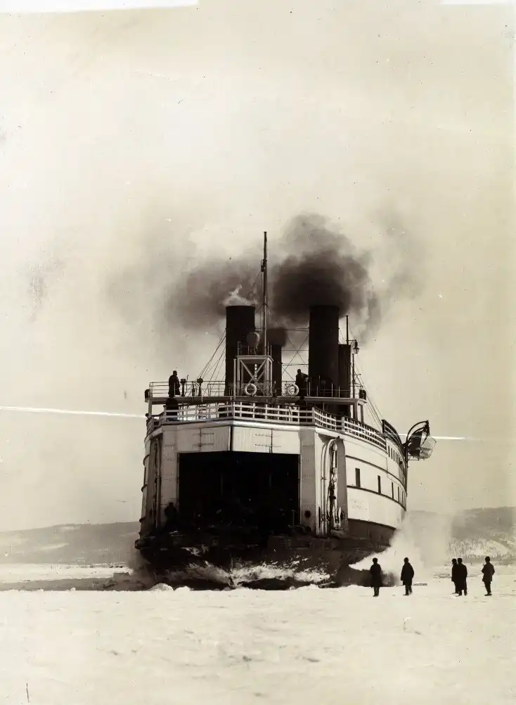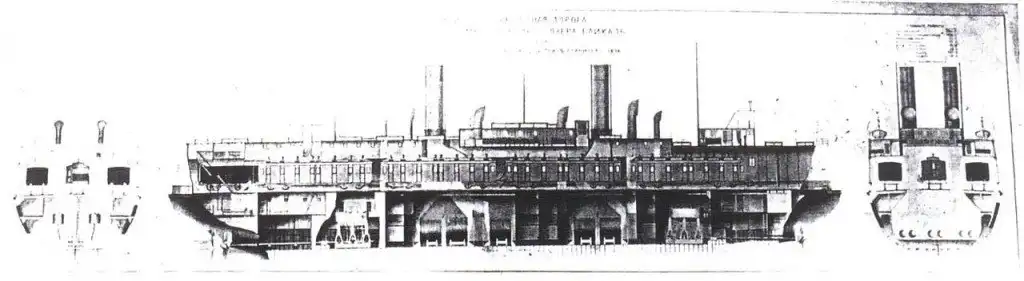 А так как металлическое судно при таких условиях обойдется не на много дороже деревянного, а по качеству будет более пригодным для перевозки поездов через малоисследованное и бурное озеро, правильнее было бы заказать пароход-паром из стали по типу пароходов на Больших Американских озерах. Вот как описывает американские ледоколы газета «Восточное обозрение»: «На Больших Американских озерах действуют ледоколы очень больших размеров и оригинальной конструкции с винтами не только на корме, но и на носу парохода. При большом нагромождении льда, когда ледокол отказывается проломить его силой своей мощи, пускается в ход этот передний винт. Сильная струя воды начинает тогда разламывать льдины у края трещины и нагромождения отчасти под поверхностью льда. Значительная часть льда впереди парохода приходит в движение, и ледокол совершенно свободно начинает свою обычную работу, ломку сплошного ледяного покрова обычной толщины».