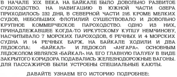 …Бои с восставшим белочешским корпусом шли уже. на подступах к Иркутску. Стремясь задержать врага, красноармейцы Листвянки и порта Байкал готовили байкальские суда к боям на берегах сибирского моря. К ним прибыл военный комиссар Центросибири М. А. Трилиссер, который, собрав членов партийного комитета, распорядился все имеющиеся суда: ледоколы «Байкал» и «Ангару», пароходы «Кругобайкалец», «Михаил», «Волну», «Малыгин», «Муравьев-Амурский»-перевести на военное положение.