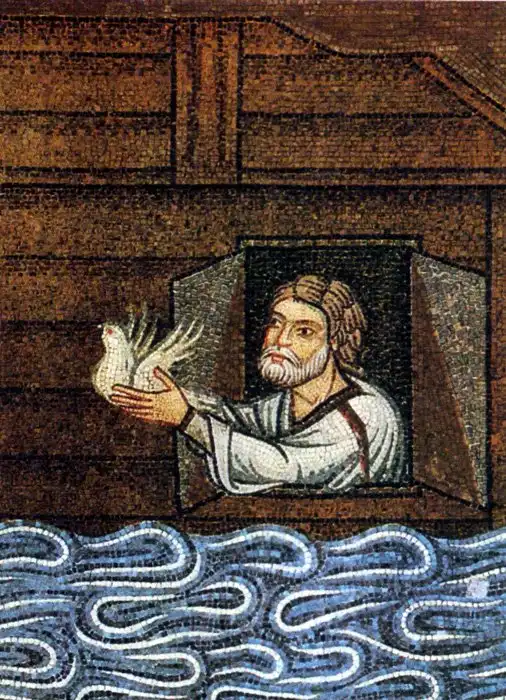Лишь на седьмой день седьмого месяца после потопа начала мало-помалу сбывать вода. Спустя некоторое время ковчег приткнулся у вершины одной из гор в Армении. Ной выпустил ворона, желая узнать, нет ли еще где-нибудь свободной от воды и уже доступной для высадки земли. Однако тот вернулся к Ною, найдя, что еще все покрыто водою. Через семь дней Ной выпустил с тою же целью голубя. Когда же последний вернулся к нему, запачканный землею и неся лист абрикоса, то Ной увидел, что Земля освободилась от воды, и, прождав еще семь дней, выпустил из ковчега животных и сам вышел со своими домочадцами. Принеся затем жертву Господу Богу, он вместе с сородичами своими устроил жертвенный пир.