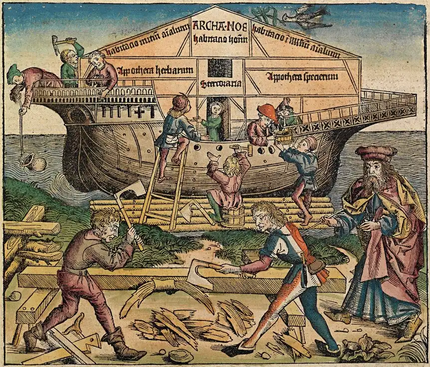 В библейском сказании Господь предупредил о потопе праведника по имени Ной и научил его, как построить ковчег: «Возьми дерево гофер и построй лодку. Разгороди лодку на отдельные помещения и осмоли ее внутри и снаружи. Длина лодки должна быть 300 локтей, ширина 50 локтей, высота 30 локтей. Сделай в лодке под крышей окно в локоть, а сбоку сделай дверь. Построй в лодке три палубы: верхнюю, среднюю и нижнюю».