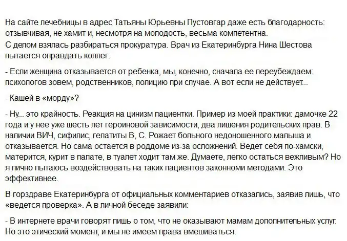 Сотрудники родильных домов Урала рассказали в соцсетях, как они поступают с матерями, отказывающимися от своих собственных детей. Оказалось, что медики делятся подобной информацией в открытую, и даже устроили своеобразное соревнование на лучшее наказание.