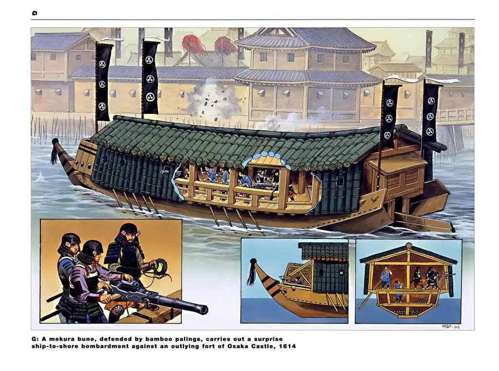Нос украшала голова дракона. Кобуксон имел две мачты и два паруса. Кроме того, существовала возможность приводить его в движение при помощи весел. Удачная конструкция повышала маневренность – корабль мог развернуться практически на месте. На каждом из бортов располагалось по 10 весел и 11 пушек, а еще одну пушку устанавливали во рту драконьей головы. Кроме того, по две пушки располагалось в передней и задней частях кобуксона, что позволяло вести огонь сразу по всем направлениям. Экипаж состоял обычно из 50-60 бойцов и 70 гребцов. Несовершенство обводов не позволяло судну развивать высокую скорость, однако в то время с этим приходилось мириться, ведь другого-то не было. На картине, найденной в старом японском храме, кобуксоны изображены в виде трехэтажных конструкций, достаточно больших даже по сравнению с современными кораблями. На верхней палубе видны пушки, на средней – лучники, на нижней – гребцы. Впрочем, известно, что у страха глаза велики. А так как не японцы разбили корейцев, а наоборот, то неудивительно, что потерпевшие поражение изобразили корабли-черепахи столь внушительными.