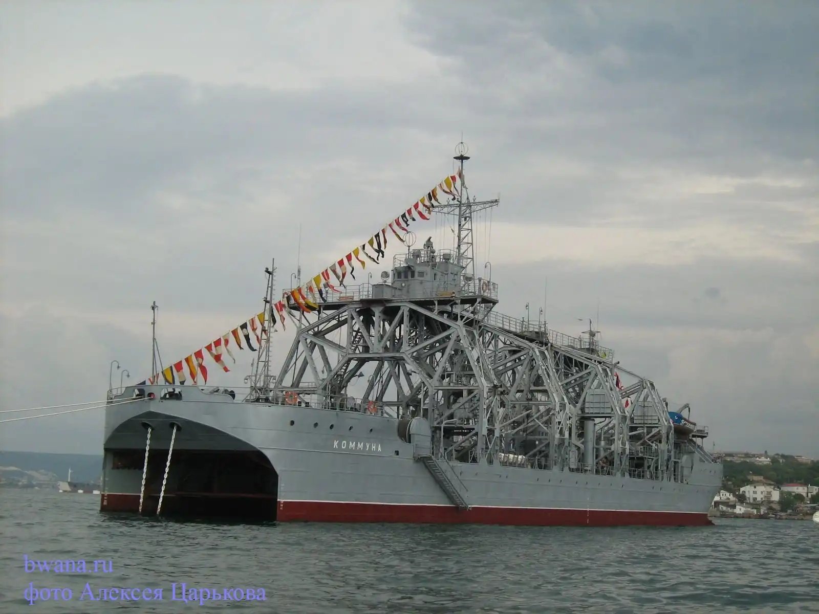 Когда этот корабль неспешно и горделиво входит в Севастопольскую бухту, даже старожилы города-героя останавливаются и глядят на него с чувством невольного почтения. Это гигантский 96-метровый катамаран, то есть фактически он представляет собой как бы два «сросшихся» корабля, и у каждого собственный двигатель. Оба корпуса соединены между собой 18-метровыми арочными фермами. На этих четырех металлических «дугах» можно было поднять из морских глубин субмарину.