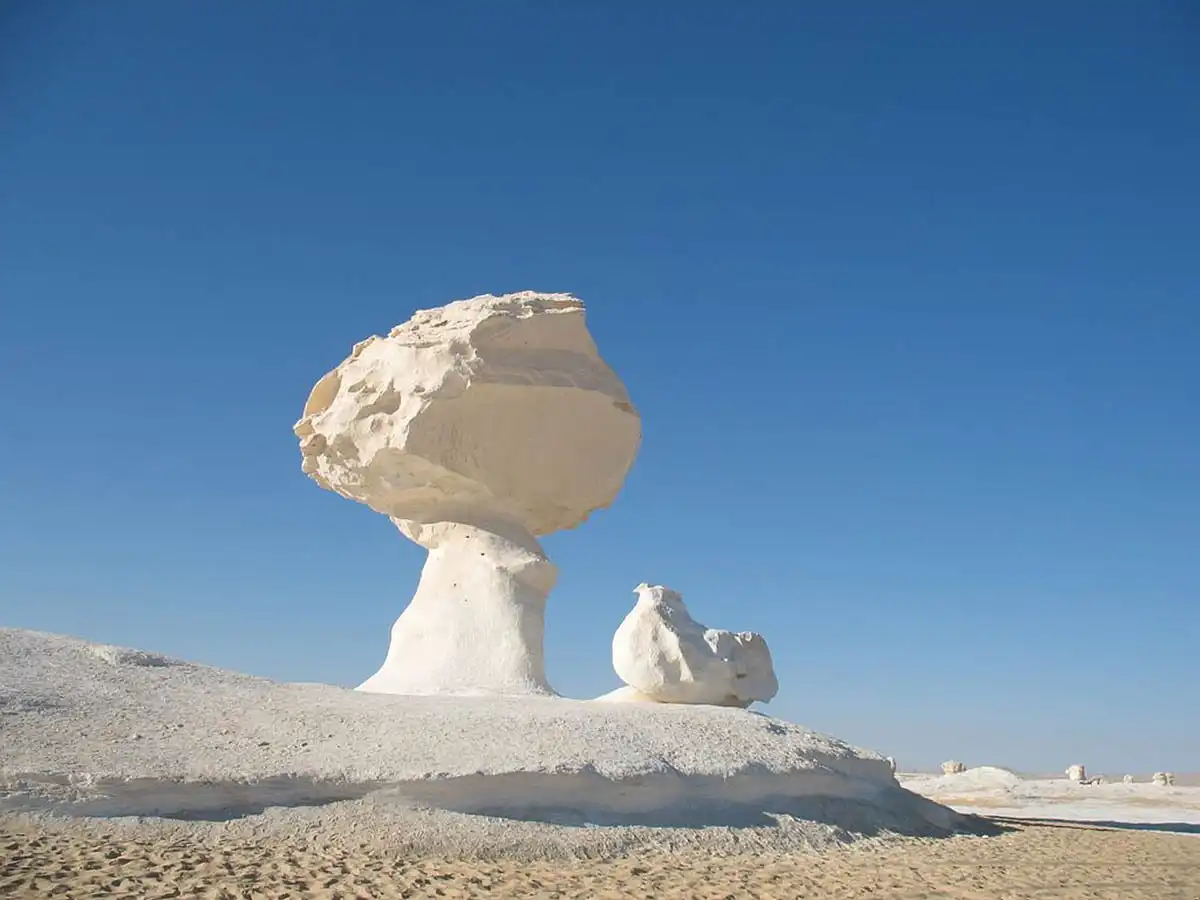 Миллионы лет назад, когда дюны Сахары еще были покрыты океаном, большие отложения мела оказались на морском дне, растерев странные известняковые образования. Когда вода отступила, ветер сформировал из этого мела необычные формы, из-за чего сегодня кажется, что пустыню охраняют гигантские белые грибы.