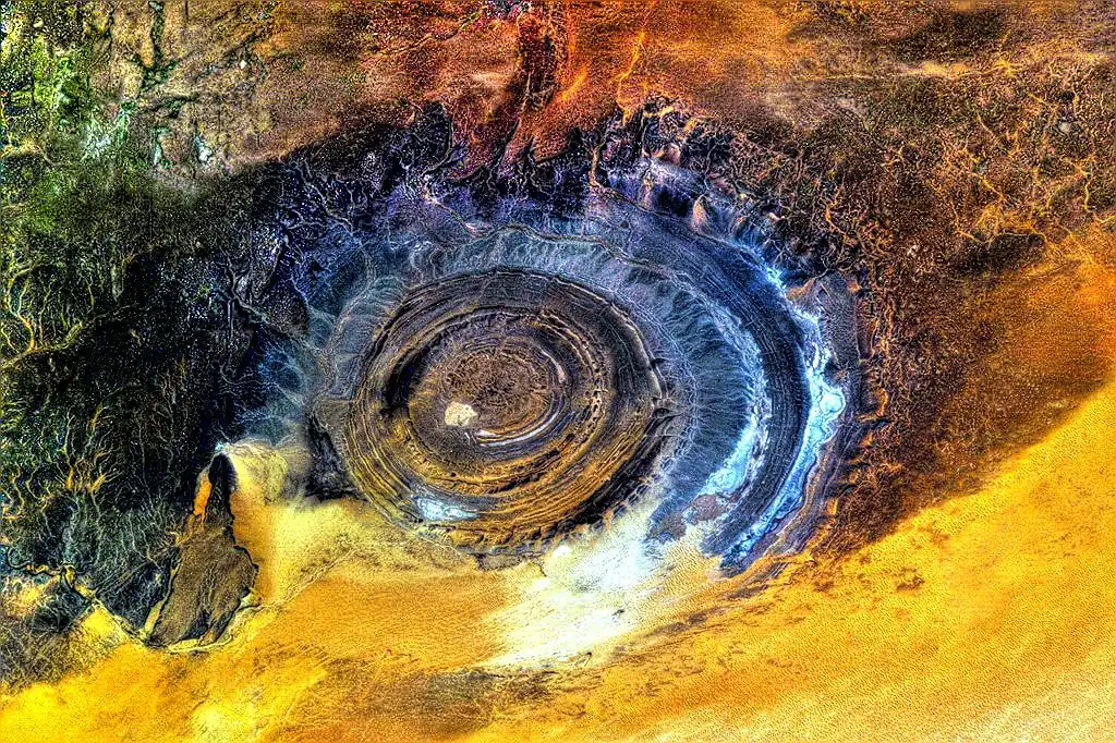 Лунные кратеры, кажется, стали немного ближе. Они в сердце пустыни Сахара, если точнее. Структура Ришат в Мавритании, общеизвестная как Глаз Сахары или Глаз Африки, продолжает очаровывать исследователей и учёных со всех уголков земного шара. Признанная одной из самых больших загадок планеты, гигантская, очень симметричная подверженная эрозии чаша была случайно замечена астронавтами, когда они делали фотографии пустыни.