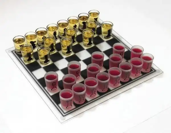На шахматной доске вместо фигур расставляются рюмки с выпивкой. Желательно, чтобы или рюмки, или выпивка имели разный цвет, дабы отличить свои фигуры от чужих. Каждая битая «фигура» выпивается ударившим.