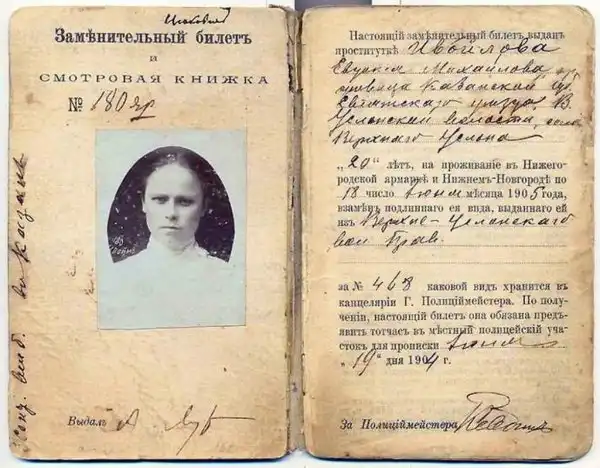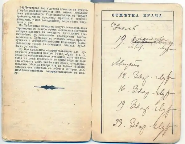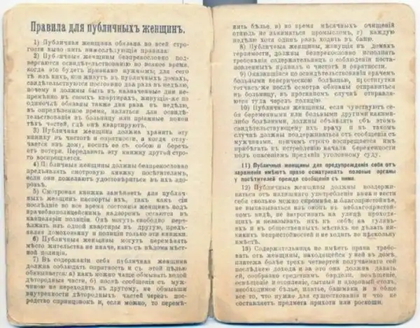 До революции проституток ставили на учет, обязывали проходить медицинский контроль не реже двух раз в месяц. Женщинам выдавали так называемый желтый билет, который иначе назывался заменительным, поскольку выдавался взамен паспорта.