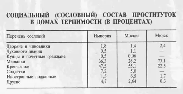 Кем были эти женщины? В России это в основном женщины из крестьянок (около 48%) и мещанок (около 36%). А вот в Петербурге состав «жриц любви» уже другой: домашняя прислуга (33%), работницы различных швейных мастерских (24%) и фабричные работницы (14%).