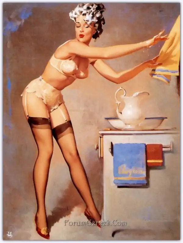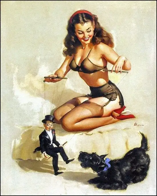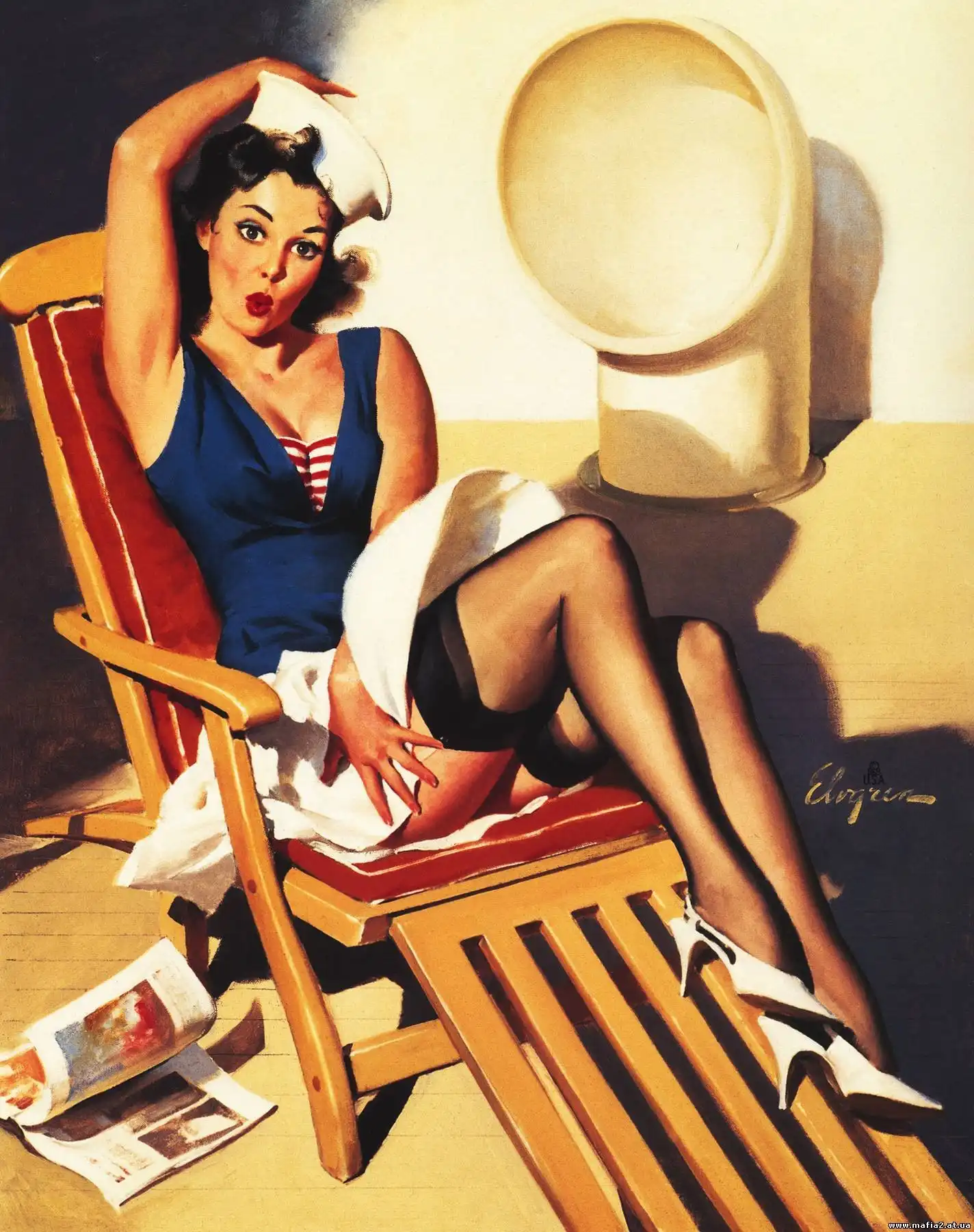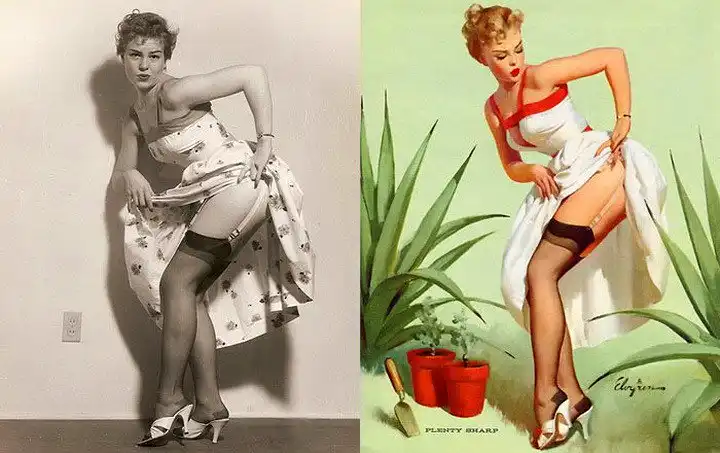 Параллельно с эротическими фото Бэтти Пэйдж существовало направление, более приемлимое для общественности. Компания Brown & Bigelow, лидер в производстве календарей и другой печатной рекламы, в 1944-м году наняла художника Джила Элвгрена для того, чтоб он рисовал 20 девушек в год как раз в модном пин ап стиле. У Элвгрена, получавшего 1000 долларов за свою иллюстрацию, главной героиней стала не роковая сексуальная красотка. А девушка-соседка, которую застали врасплох в пикантной ситуации. Пуританское общество не стало падать в обморок от картинок, где подул ветер и задрал подол юбки, платье зацепилось за невысокий забор и все увидели кружево на чулках.