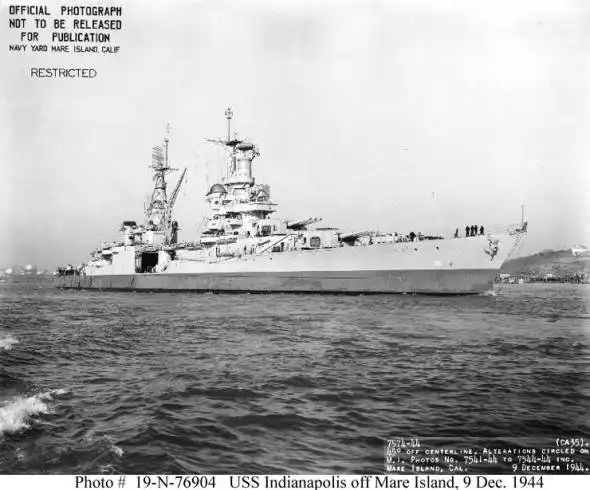 Тяжелый крейсер Индианаполис был заложен 30 марта 1930 года. Корабль был спущен на воду 7 ноября 1931 года и введен в строй 15 ноября 1932 года. Полное водоизмещение корабля 12755 тонн, 185,93 м — длина, 20,12 м — ширина, 6,4 м — осадка. Крейсер развивал скорость до 32,5 узлов при мощности турбин 107000 лс. Вооружение корабля состояло из девяти 203-мм орудий в трех башнях, восьми 127-мм орудий и 28 зенитных автоматов разных калибров. На корабле были две катапульты и четыре самолета. Экипаж корабля в 1945 году был 1199 человек.