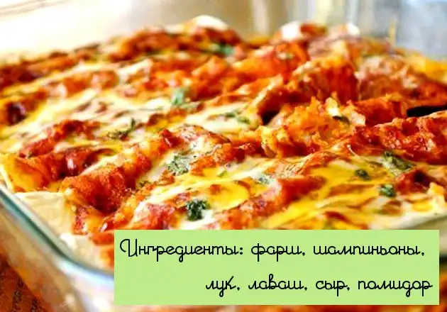 Ингредиенты: полкило фарша, столько же сырых шампиньонов или других грибочков, пара луковиц, пачка лаваша, столовая ложка муки, немного твердого сыра, можно помидор, соль-перец.