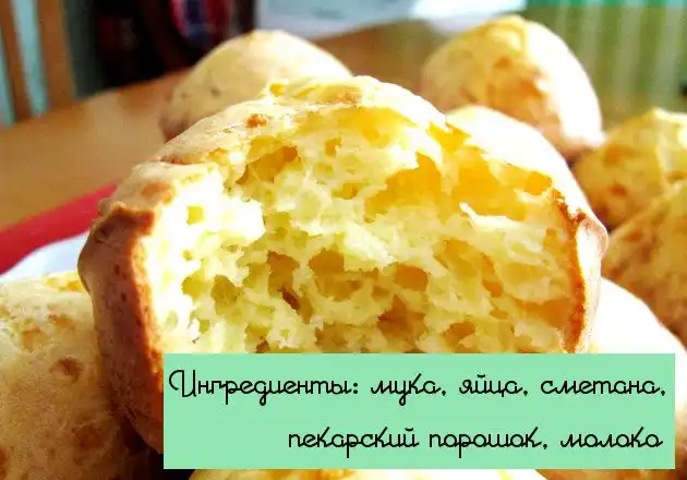 Ингредиенты:100 г сыра, примерно столько же муки, чайная ложка пекарского порошка, немного молока, пара яиц, по 2 столовых ложки сметаны и оливкового масла.