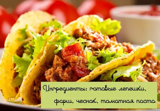 Ингредиенты: покупные лепешки (если хочешь особенно выпендриться, найди специальные кукурузные, но сойдут любые нетолстые), полкило мясного фарша, пара луковичек, несколько помидоров побольше и поспелее или полбанки томатного соуса, несколько зубчиков чеснока, твердый сыр, зелень и овощи по вкусу (зеленый салат, лук, болгарский перец, капуста), побольше специй – острых, хороших и разных (перец чили, куркума, кумин и т. д.).