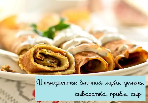 Ингредиенты: полтора стакана блинной муки, 100 мл сыворотки, полкило грибочков, луковка, сырная нарезка, зелень.