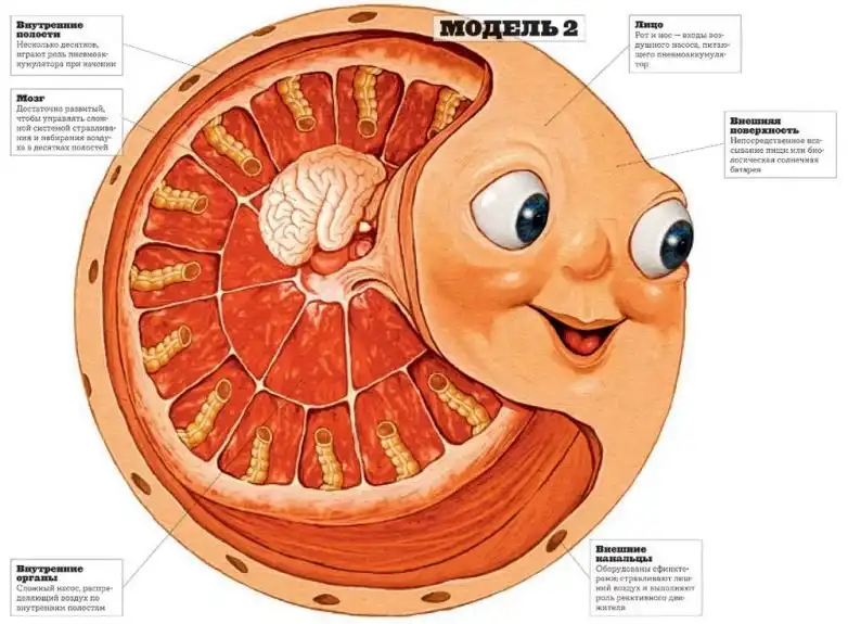 Вторая модель чуть сложнее: Колобок состоит из набора изолированных сегментов. За счет быстрой накачки или откачки воздуха из отдельных сегментов (через пневмоаккумулятор) герой сказки движется и совершает небольшие прыжки; направление уточняется стравливанием газа через внешние сфинктеры.