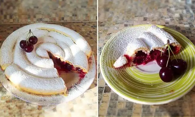 Процесс выпекания вишнёвого пирога немного затрудняется из-за сочности ягод, которые при воздействии высоких температур начинают выпускать сок. Но это не проблема.