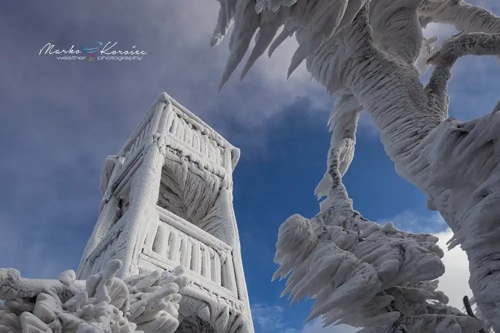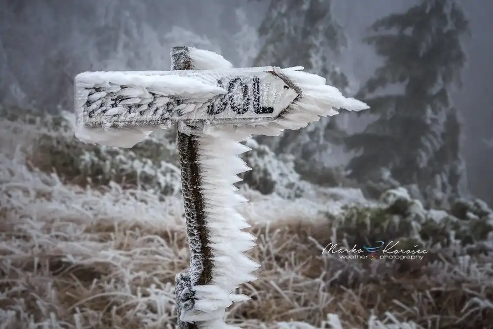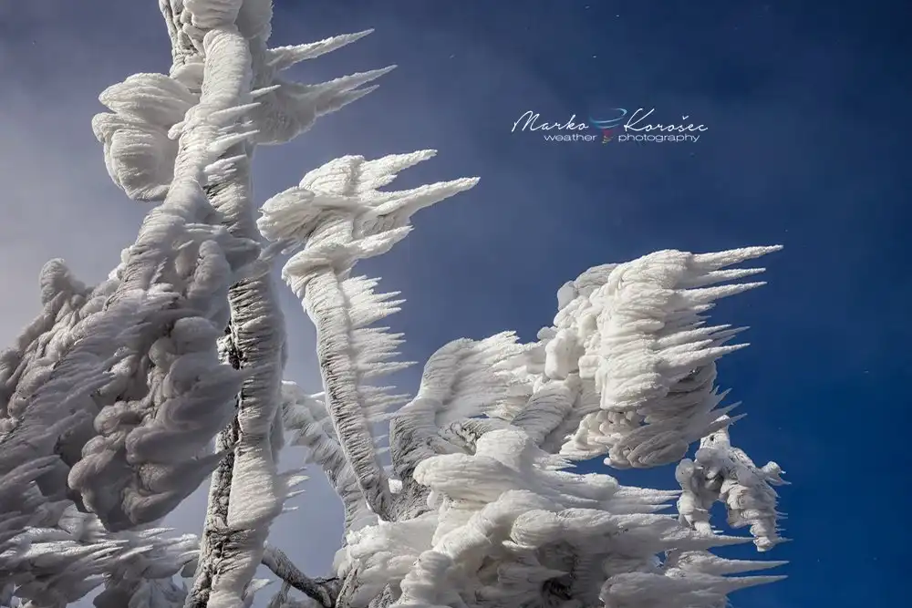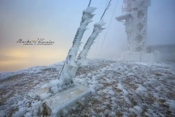 Тем не менее, в восточной Словении Марко обнаружил вполне подходящий для реализации своей апокалиптической фотосерии ландшафт. Снимки были сделаны в районе популярного горнолыжного центра Яворник приблизительно в 55 км от Любляны - на склонах одноименной вершины и других близлежащих гор (высота которых доходит до 1242 м над уровнем моря). Корозек отмечает, что ледяные наросты достигали порой почти метра в длину (порядка 3 футов). Деревья и наблюдательные вышки практически полностью оказались покрыты толстым слоем льда и инея под воздействием сильных ветров и тумана. Ниже вы можете видеть некоторые фотографии, сделанные Marko Korosec в районе горы Яворник.