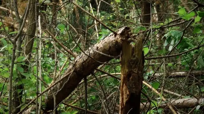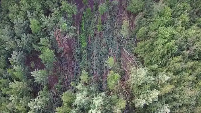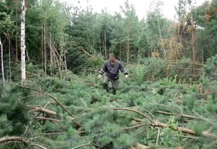 – Такое бывает при сильном ветре, – говорит Завьялов. – Но тогда лес лежит на большой территории, то тут, то там видны поваленные деревья. А в этом месте удар пришелся точечно. Деревья лежат сплошняком, а в метре от этого места все в порядке. Граница очень четкая, это и странно. А самое главное, деревья, хоть и повалены, но продолжают жить, и ветки уже тянутся к солнцу.