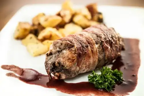 Разложите лопатку пластом и размажьте по внутренней стороне луково-чесночную смесь. Посолите, поперчите и положите сверху ломтики баклажанов. Сверните мясо в рулет, обвяжите шпагатом, переложите на противень и вылейте на него половину подготовленного вина.