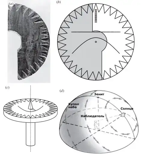 Этот кусочек солнечных часов (a) археологи нашли в Гренландии