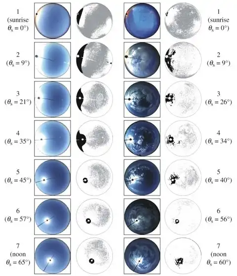 Учёные установили, что как при чистом небе (колонки слева), так и при облачном (справа) доля от общей площади неба, в которой поляризация совпадает с релеевской (закрашена серым) падает по мере подъёма Солнца (чёрная точка) над горизонтом (угол подъёма указан в скобках). Данная съёмка проводилась в Тунисе.