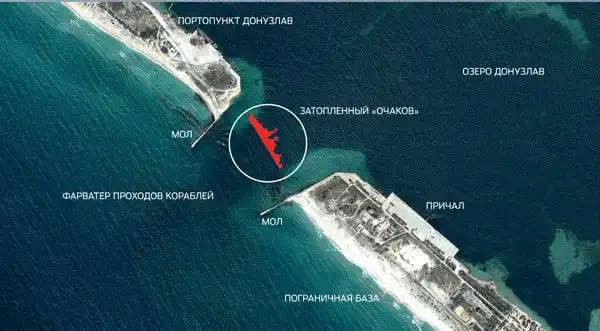 Противолодочный корабль «Очаков» был спущен на воду 30 апреля 1971 года в рамках проекта 1134-Б (или «Беркут-Б»). Всего в 1960—1970-х годах было построено семь таких кораблей — шесть из них в 2011 году признаны окончательно устаревшими и отправлены на слом, лишь БПК «Керчь», пройдя плановый ремонт, продолжил службу в российском ВМФ. «Очаков» же был выведен из состава флота и в течение трех последних лет с демонтированным вооружением стоял на вечном приколе в Севастополе. В ночь с 5 на 6 марта 2014 года он был отбуксирован к выходу из бухты озера Донузлав и затоплен; его огромный, 162-метровый корпус перекрыл узкий судоходный канал наполовину.
