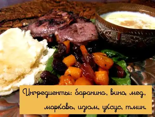 Для моркови в соусе берем: поровну морковки и изюма (который, собственно, и есть виноград, только в зрелом возрасте), по паре столовых ложек оливкового масла, меда и сладкого вина, тмин, черный перец.