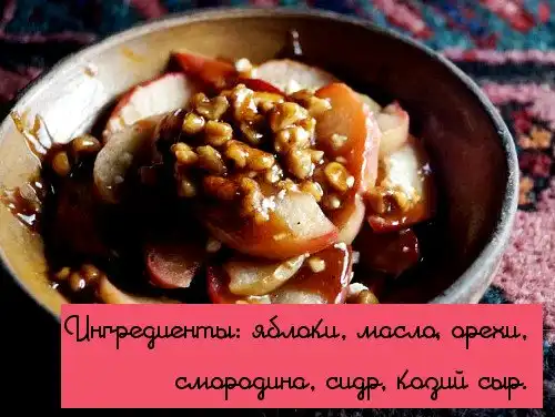Берем: 2 яблока, по 2 столовых ложки соленого масла и меда, полторы чашки сидра, 100 г козьего сыра, орехи и смородину (и что еще годится для топпинга), немного корицы и молотого перца.