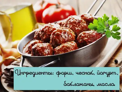 Нарезанный баклажан провариваем 5 минут, тушим до мягкости, давим вилкой и добавляем йогурт, чеснок, соль и специи. Из фарша (посолив-поперчив его) формируем фрикадельки, обжариваем в масле до золотисто-коричневости, потом заливаем водой и тушим еще минут 10. Добавляем баклажаны, доводим до кипения и готовимся вкушать.