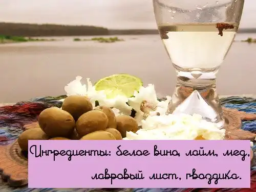Берем: бутылку белого вина, лайм, 3-4 столовых ложки меда, палочку ванили, пару листиков лаврушки, десяток гвоздичин, щепотку белого перца.