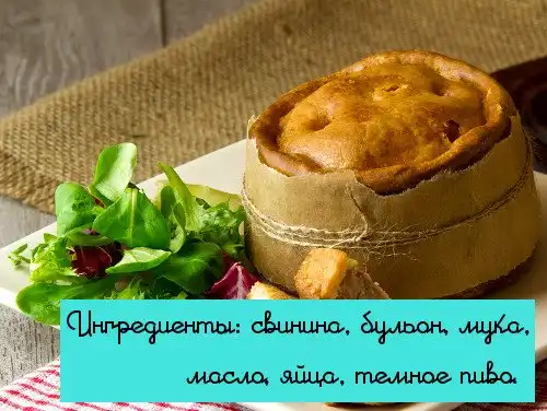 Берем: 200 г свиной вырезки, около килограмма свинины, по полчашки нарезанной морковки, лука и пастернака, небольшую репку, по полчашки говяжьего бульона и темного пива, чашку грибов, 6 столовых ложек растительного масла и 3 – муки. Для теста: 3 с половиной стакана муки, пачку масла, пара яиц, соль.