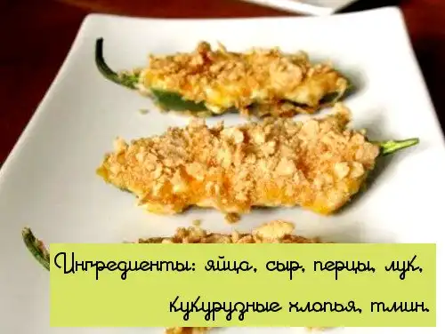 Берем: по 200 г мягкого сливочного сыра и тертого твердого, луковицу, полтора десятка острых зеленых перцев, пару яиц, пару чашек измельченных кукурузных хлопьев, немного молока, тмин, кайенский перец.