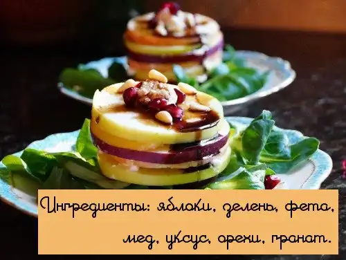 Берем: два яблока, пучок зелени (рекомендуется маш-салат), грамм 50 сыра типа феты, 3 столовых ложки нагретого меда, 2 чайных ложки бальзамического уксуса, орехи (можно не лесные, а кедровые орешки), зернышки граната для украшения.