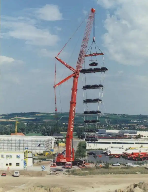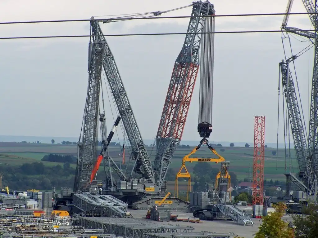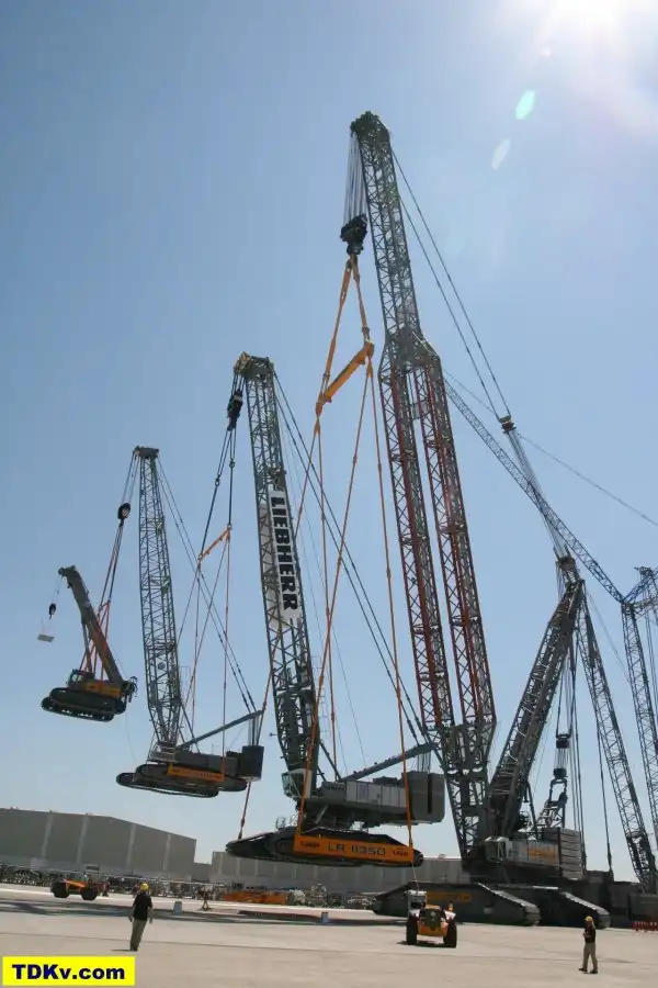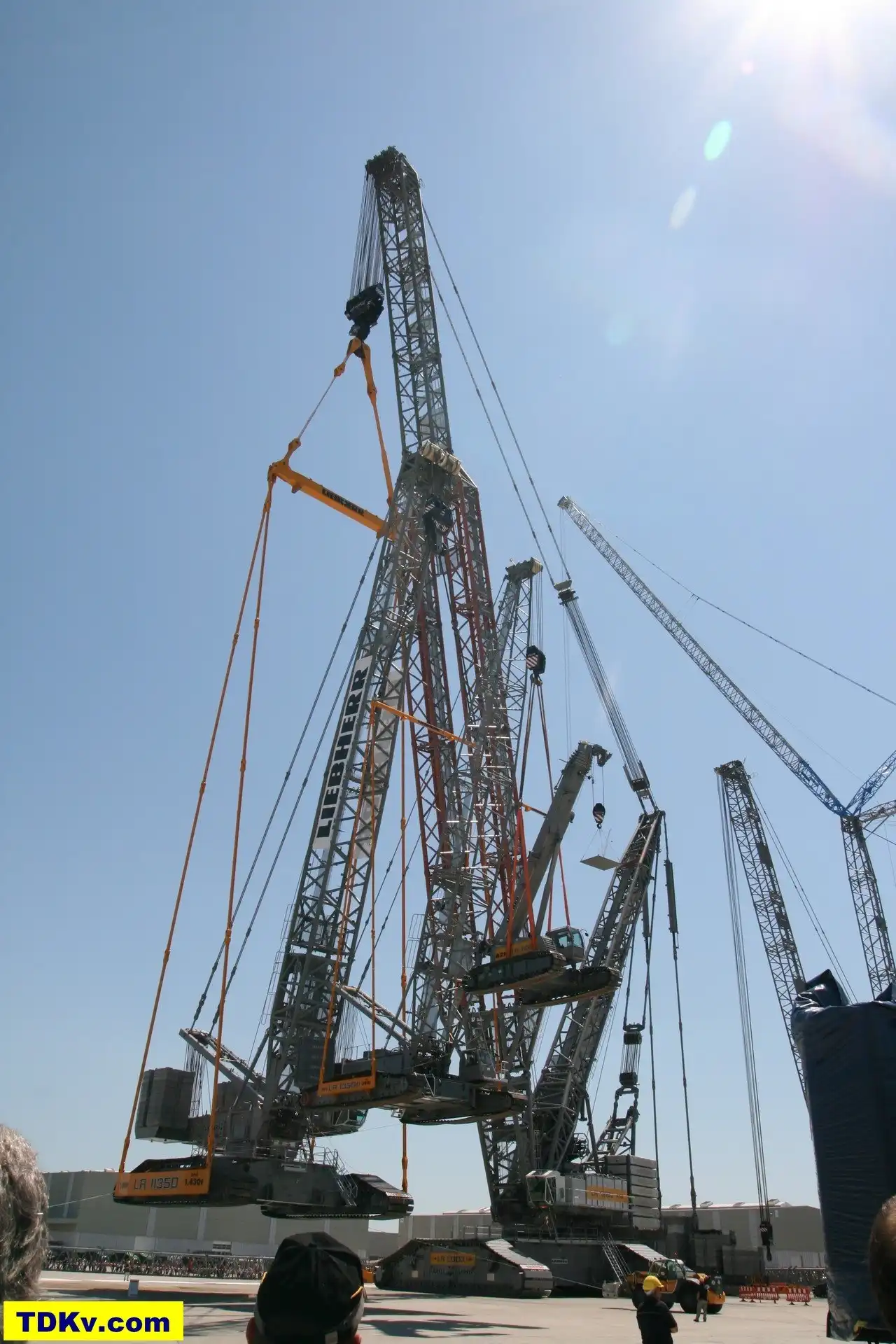 Немецкая компания Liebherr, с 1949 года занимается разработкой и производством тяжелой подъемной техники. Несколько лет назад, в 2012 году компания произвела внушительную демонстрацию возможностей своей техники, на которой можно было увидеть, как маленький подъемный кран (который сам по себе уже является достаточно большим механизмом) был поднят большим подъемным краном, который был поднят огромным краном и который, в свою очередь, был поднят самым большим и мощным самоходным подъемным краном на сегодняшний день.