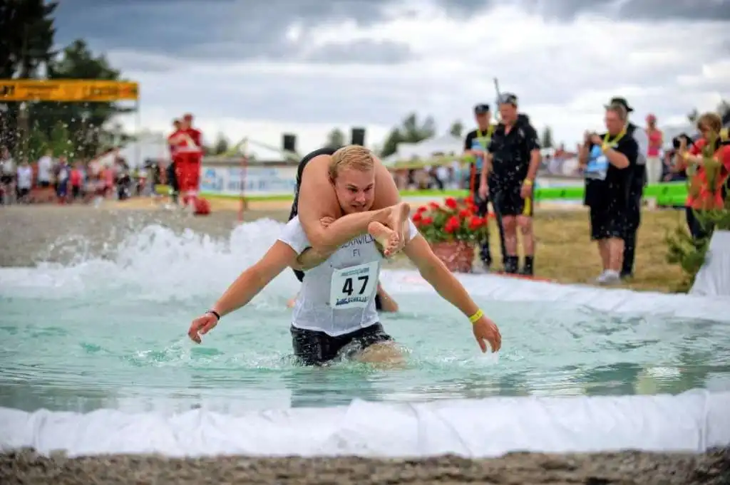 Ношение жён. Эту игру придумали фины… Мужчины, принимающие участие в конкурсе выигрывают пиво в количестве, соответствующем весу жены. На фото: финская пара — Ville Parviainen и Джанет Оксман, которые выиграли гонку в прошлом году.