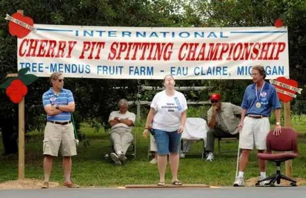Международный чемпионат по плеванию вишнёвыми косточками. Это соревнование, которое было придумано в 1974 году, чтобы отпраздновать сбор вишен, до сих пор ежегодно проводится в штате Мичиган. В 2014 году победителем стал Brian «Young Gun» Krause.