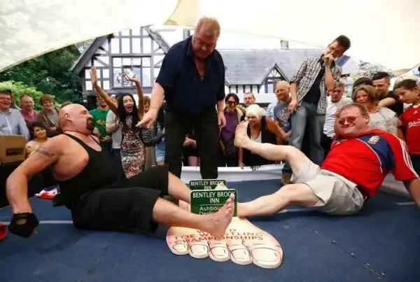 Toe wrestling. Это интересная борьба большими пальцами ног. Противники сжимают пальцы и выигрывает тот, который прижмёт стопу соперника к полу. Алан «Насти» Нэш (слева) из Великобритании является действующим чемпионом.