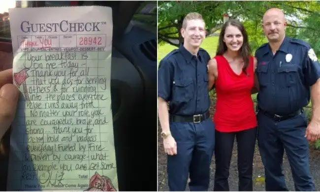 Подкрепившись, пожарные попросили у официантки счет. Но Лиз, заметив, насколько сильно они вымотаны, сама оплатила их счет, и оставила им записку: