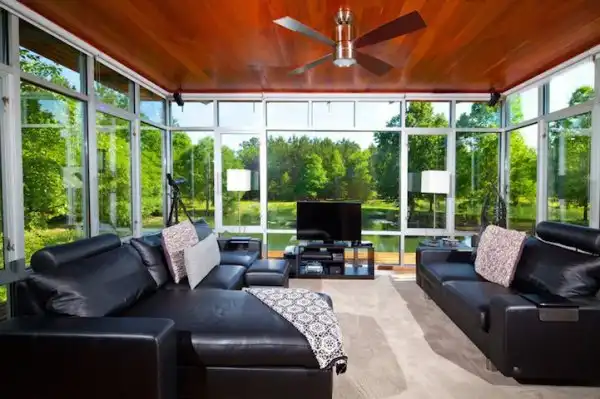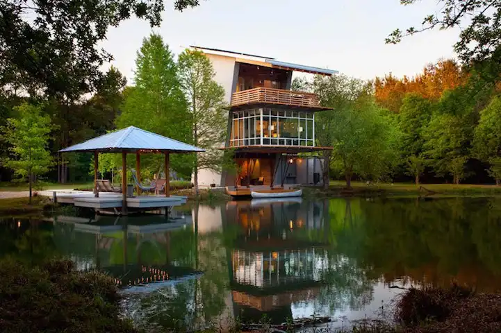 Натуралистичность дома усиливается окружающими его роскошными дубами, а также тем фактом, что одна из сторон Pond House выходит к пруду. Это настоящее пристанище для релаксации. Особенно красиво смотрится данное трехэтажное здание в темное время суток, когда загораются фонари. Помимо эстетичности, Pond House обладает очень важной функциональной составляющей. На крыше дома установлены специальные водосборники, возвращающие воду из пруда, выпавшую в виде осадков, обратно в водоем. Кроме того, на крыше установлены солнечные фотоэлементы, накапливающие электроэнергию. Так что дом вполне самодостаточен. Как видите, взаимодействие с природой может быть красивым и взаимно полезным.