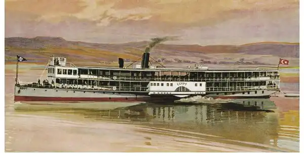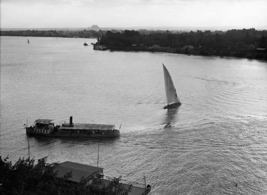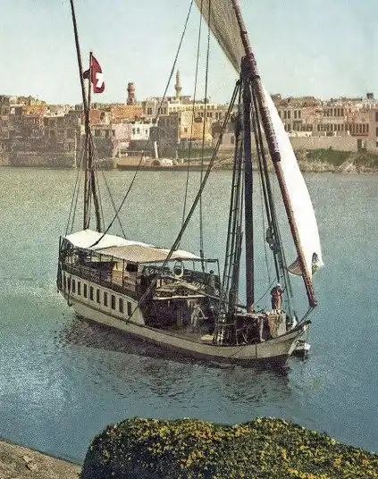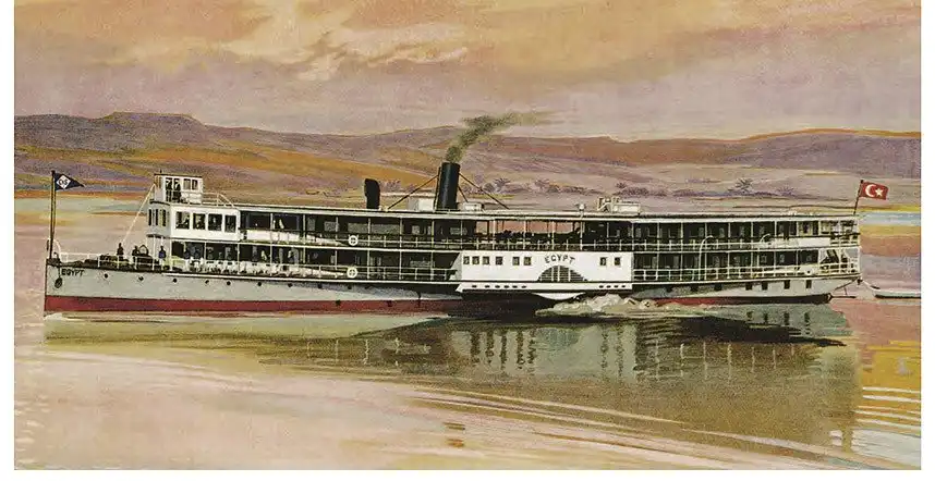 Первые пассажиры по Нилу плавали в дахабьях, лодках с плоским дном, в стиле судов, используемых мамлюками с 13-го века. Этот рисунок показывает дахабья в Каире, возможно, в ожидании попутного ветра, что бы плыть вверх по реке против течения. Обратите внимание, как на дальнем берегу причалил пароход.