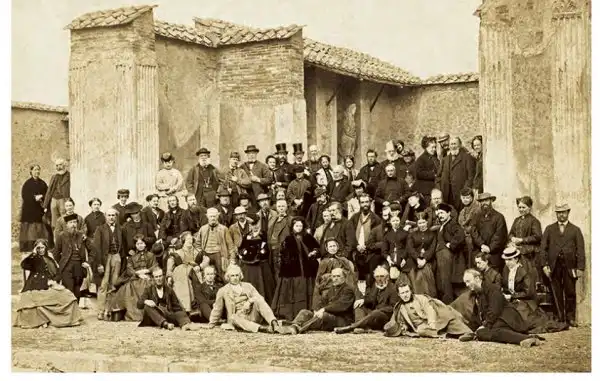 Томас Кук совершил свой первый исследовательский визит в Египет в 1868 году. В том же году он сфотографировался в Помпеях. Он сидит спереди в центре.