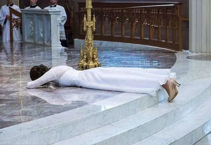 Епископ надел обручальное кольцо на палец Джессики, символизирующее её брак с Христом.