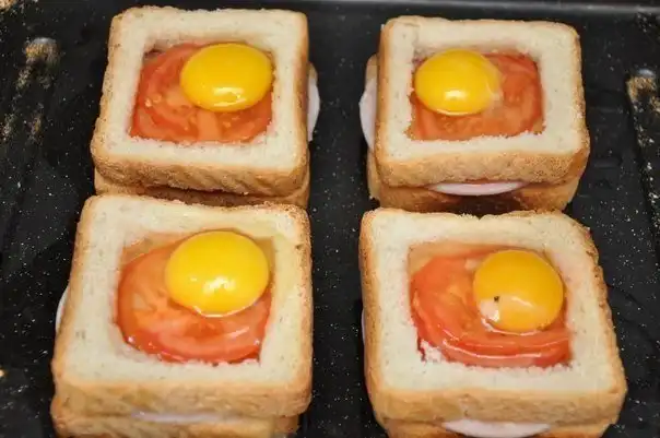 2. На остальные 4 кусочка хлеба положить по 2 пластинки ветчины, на них – оставшиеся 4 хлебных "ободка" без мякиша. Внутрь ободков положить нарезанные кружочки помидоров и разбить в каждый бутерброд по яйцу. Посолить, поперчить.
