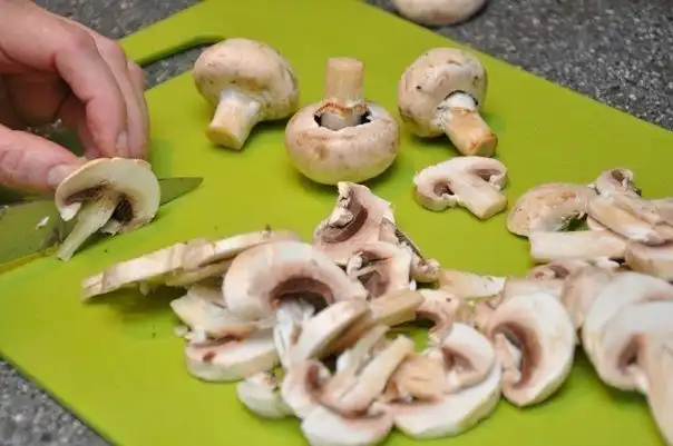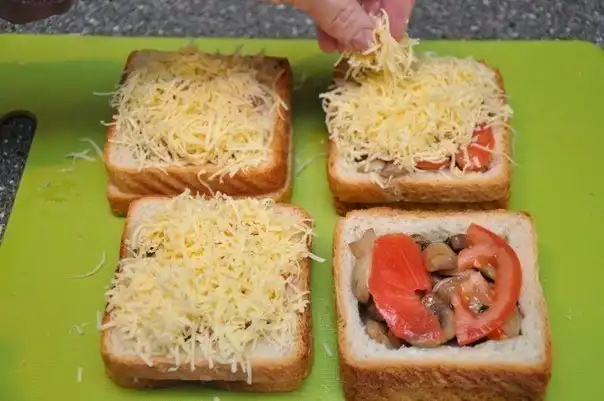 1. Из 8 кусков хлеба острым ножом вырезать мякиш. Получатся хлебные "ободки" из корочек. 8 целых кусочков хлеба выложить на противень, на 4 из них положить хлебные "ободки". Заполнить их заранее обжаренными грибами, посолить, поперчить и посыпать тертым сыром.