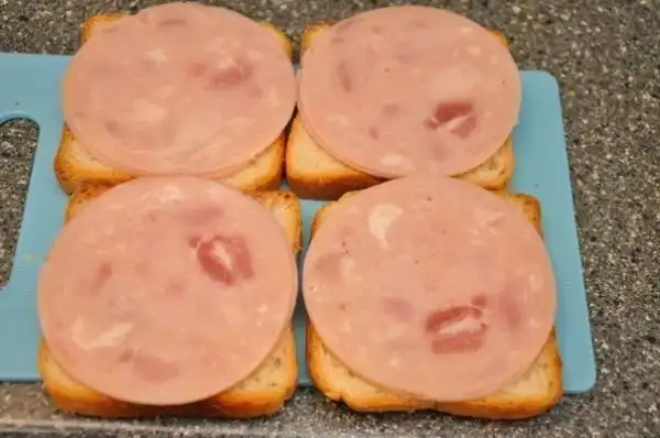 3. Отправить противень с 8 бутербродами в нагретую духовку и запекать при 180 С, пока не "схватятся" яйца и не расплавится сыр.