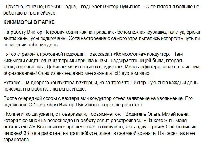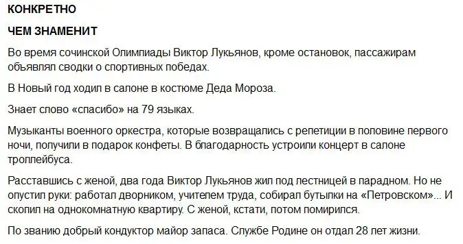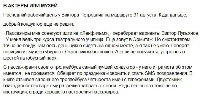 Виктор Лукьянов проработал два с половиной года кондуктором троллейбуса № 8. За это время он видел немало улыбок и удивленных взглядов, ведь он не типичный кондуктор общественного транспорта. За время работы, он покупал и раздавал сладости безбилетникам и тем кто уступает место пенсионерам, инвалидам и женщинам, оплачивал за них проезд своей картой. К сожалению это все продолжалось не долго и история закончилась, увы, не лучшим образом.