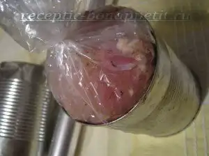 Отрезать необходимую длину пакета для запекания и завязать один конец ниткой. Застилаем пакет в банку жестяную (объемом около 600мл), плотно укладываем мясо и завязать оставшийся конец.