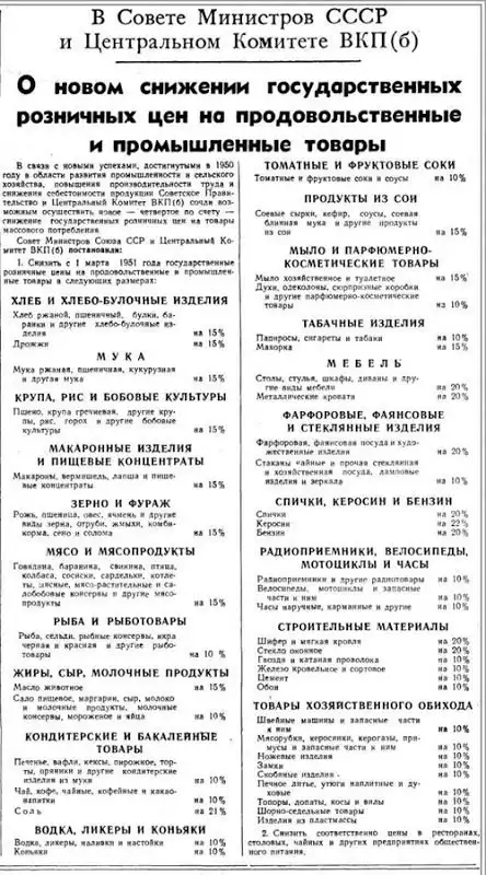 В связи с дальнейшим подъемом народного хозяйства СССР, ростом производства товаров массового потребления и новыми достижениями в области снижения себестоимости продукции во второй половине 1948 года создалась возможность осуществить новое снижение цен на товары массового потребления. Совет Министров СССР и ЦК ВКП(б) решили осуществить это второе снижение цен, которое частично уже было начато в 1948 году, и завершить его полностью 1 марта 1949 года. Это будет второй этап снижения цен на товары массового потребления.