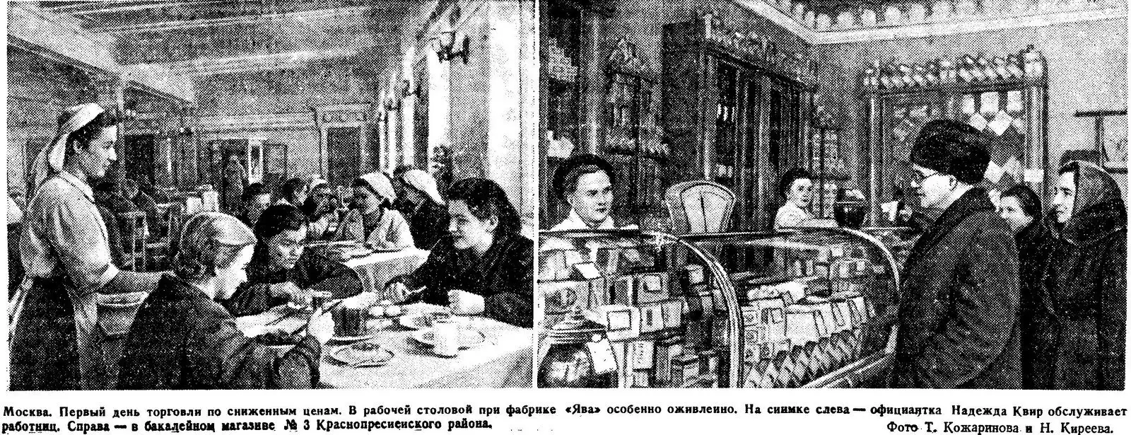 При проведении в конце 1947 года денежной реформы и отмены карточной системы были отменены высокие цены коммерческой торговли и введены единые сниженные государственные розничные цены на товары массового потребления. Это был первый этап снижения цен на товары массового потребления.